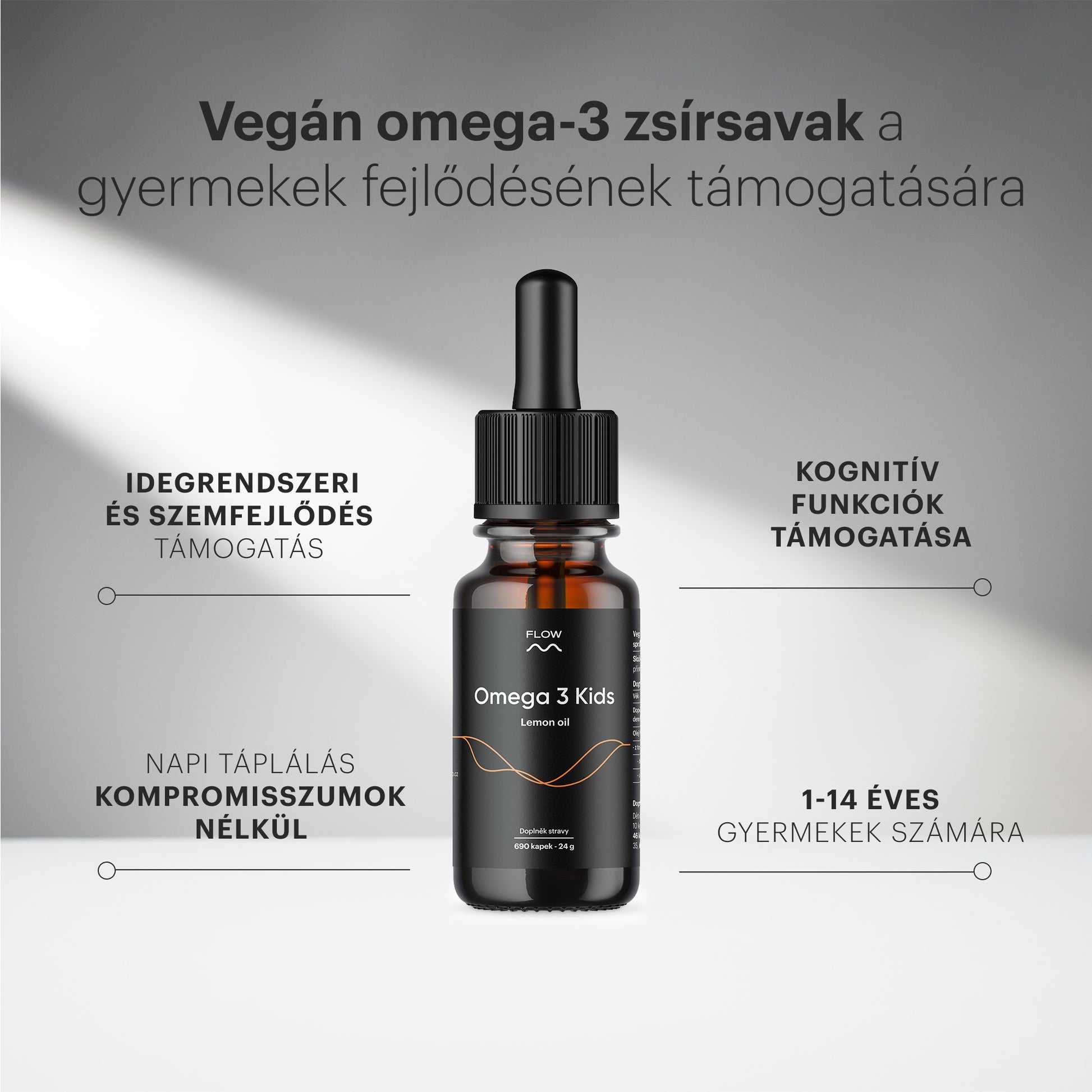 Vegán omega-3 zsírsavak az 1–14 éves gyermekek egészséges fejlődésének támogatására.